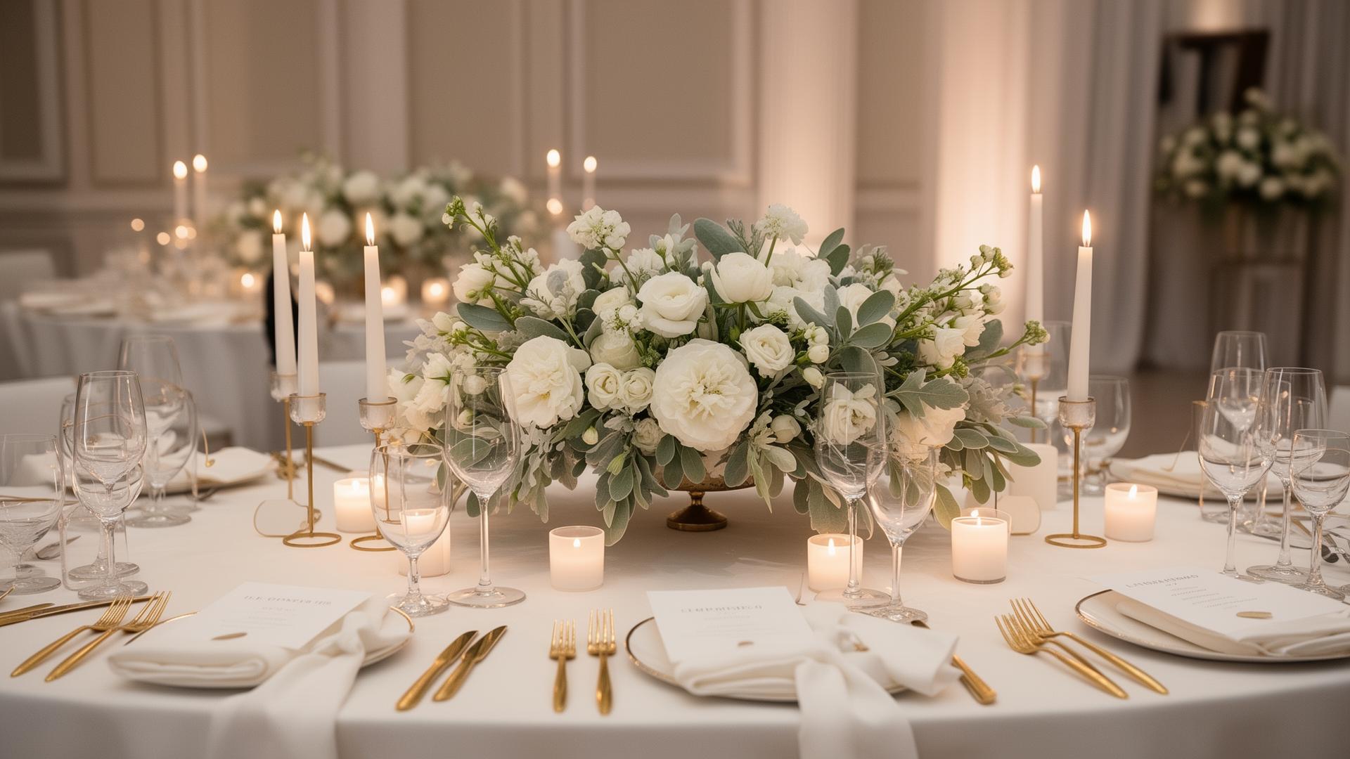La opción más completa: espejo personalizado + bases decorativas doradas + arreglo floral diseñado acorde a los colores de tu evento. Impacto visual desde la entrada.